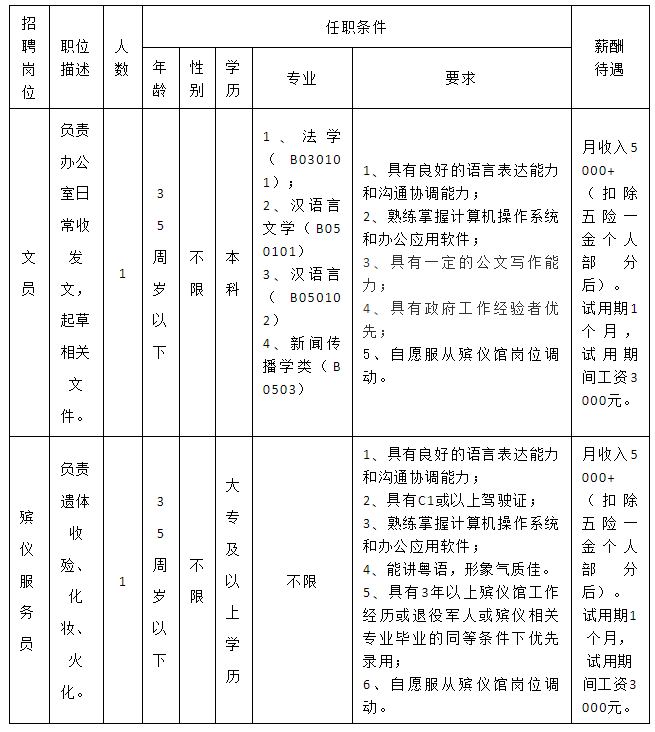 5.熱愛殯葬事業(yè),具有正常履行職責(zé)的身體條件、心理素質(zhì)和符合職位要求的工作能力;