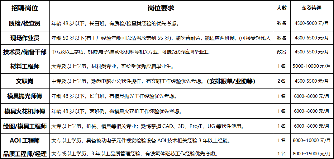 福利待遇:五險一金\各類補貼\培訓(xùn)\包食宿\體檢等。