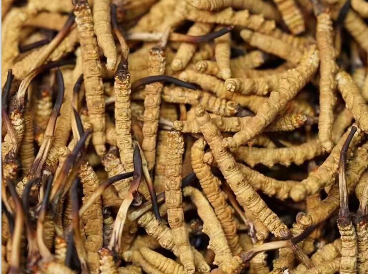 冬蟲(chóng)夏草菌子囊菌之子座出自寄主幼蟲(chóng)的頭部,單生,細(xì)長(zhǎng)如棒球棍狀,長(zhǎng)3~11厘米;不育柄部長(zhǎng)3~8厘米,直徑1.5~4毫米;上部為子座頭部,稍膨大,呈圓柱形,長(zhǎng)1.5~4厘米,褐色,除先端小部外,密生多數(shù)子囊殼;子囊殼大部陷入子座中,先端凸出于子座之外,卵形或橢圓形,長(zhǎng)250~500微米,直徑80~200微米,每一子囊殼內(nèi)有多數(shù)長(zhǎng)條狀線形的子囊;每一子囊內(nèi)有8個(gè)具有隔膜的子囊孢子。寄主為鱗翅目、鞘翅目等昆蟲(chóng)的幼蟲(chóng),冬季菌絲侵入蟄居于土中的幼蟲(chóng)體內(nèi),使蟲(chóng)體充滿菌絲而死亡。夏季長(zhǎng)出子座。夏至前后,當(dāng)積雪尚未溶化時(shí)入山采集,此時(shí)子座多露于雪面。挖起后,在蟲(chóng)體潮濕未干時(shí),除去外層的泥土及膜皮,曬干。或再用黃酒噴之使軟,整理平直,每數(shù)條用紅線扎成小把;用微火烘干。冬蟲(chóng)夏草為蟲(chóng)體與菌座相連而成,全長(zhǎng)9~12厘米。蟲(chóng)體如三眠老蠶,長(zhǎng)約3~6厘米,粗約0.4~0.7厘米。外表呈深黃色,粗糙,背部有多數(shù)橫皺紋,腹面有足8對(duì),位于蟲(chóng)體中部的4對(duì)明顯易見(jiàn)。斷面內(nèi)心白色,或略發(fā)黃,周邊顯深黃色。菌座自蟲(chóng)體頭部生出,呈棒狀,彎曲,上部略膨大。表面灰褐色或黑褐色,長(zhǎng)可達(dá)4~8厘米,徑約0.3厘米。折斷時(shí)內(nèi)心空虛,粉白色。微臭,味淡。主產(chǎn)青海、西藏、四川、甘肅、云南、貴州。