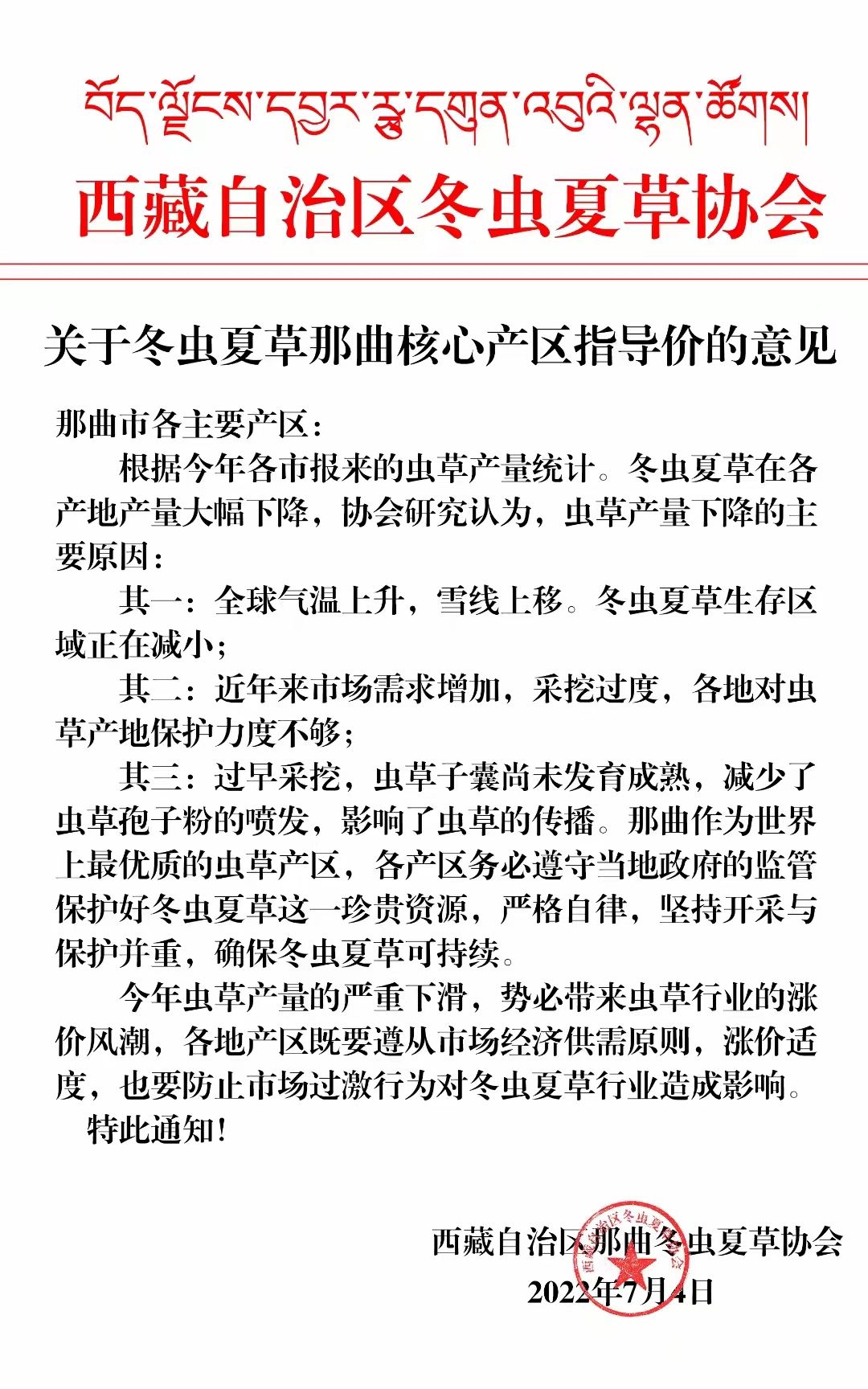 那曲作為世界上最優(yōu)質的蟲草產區(qū),各產區(qū)務必遵守當?shù)卣谋O(jiān)管保護好冬蟲夏草這一珍貴資源,嚴格自律,堅持開采與保護并重,確保冬蟲夏草可持續(xù)。今年蟲草產量的嚴貢下滑,勢必帶來蟲草行業(yè)的漲價風潮,各地產區(qū)既要遵從市場經(jīng)濟供需原則,漲價適度,也要防止市場過激行為對冬蟲夏草行業(yè)造成影響。特此通知!