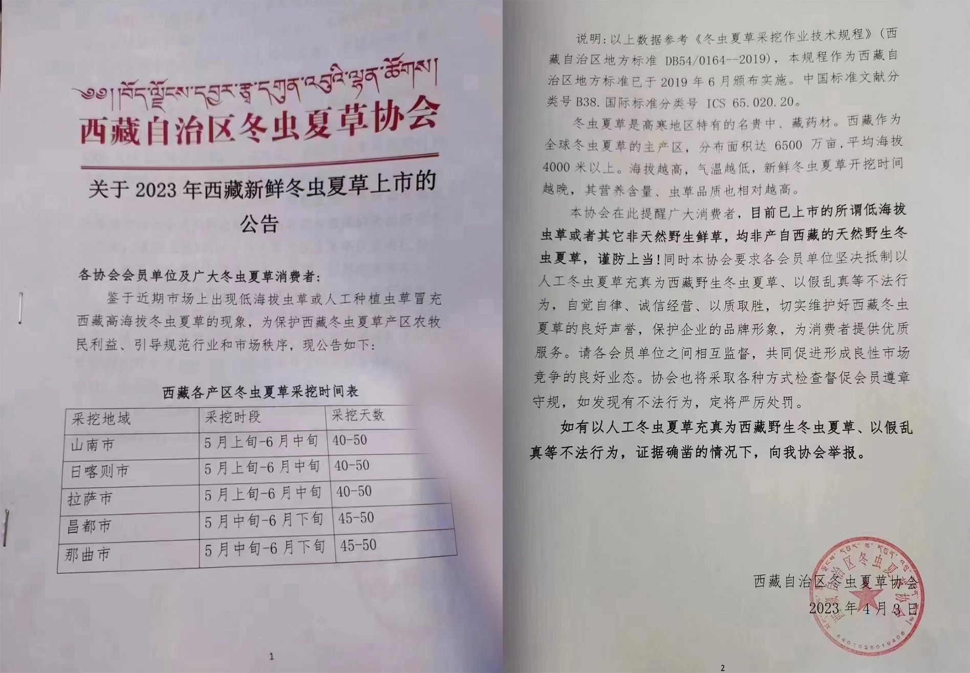 鑒于近期市場上出現(xiàn)低海拔蟲草或人工種植蟲草冒充西藏高海拔冬蟲夏草的現(xiàn)象,為保護西藏冬蟲夏草產(chǎn)區(qū)農(nóng)牧民利益、引導(dǎo)規(guī)范行業(yè)和市場秩序,現(xiàn)公告如下: