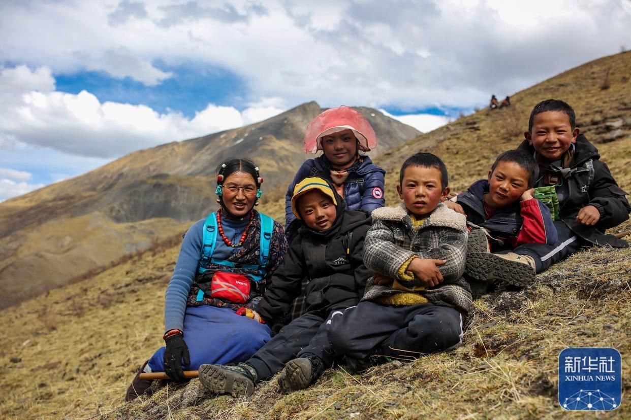 牧民其美嘎德(左一)在蟲草采挖間隙和當?shù)匾恍┖⒆釉谝黄穑?月25日攝)。新華社記者 姜帆 攝