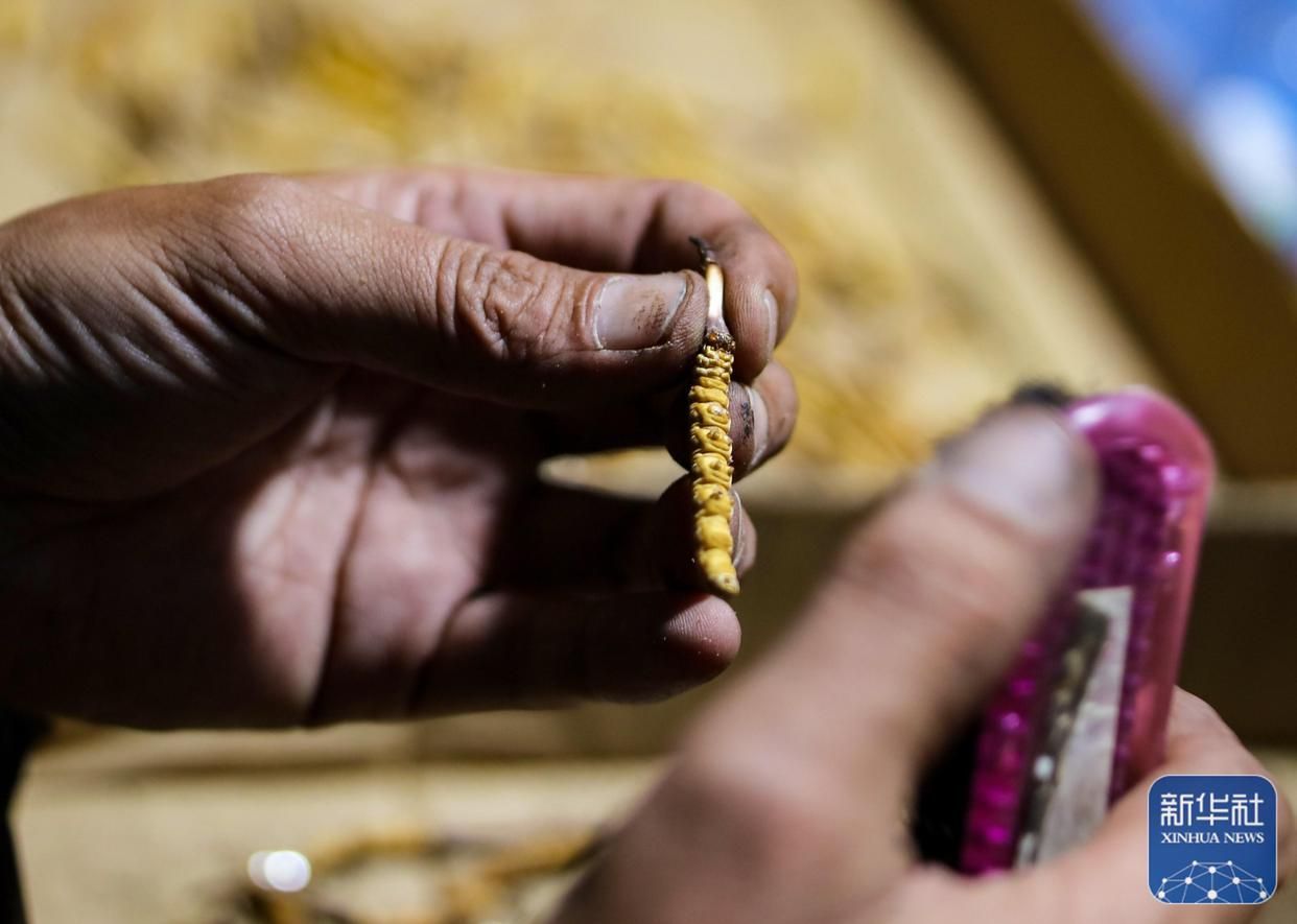 傍晚回到采集點營地后,牧民在用毛刷清理蟲草上的土(5月25日攝)。