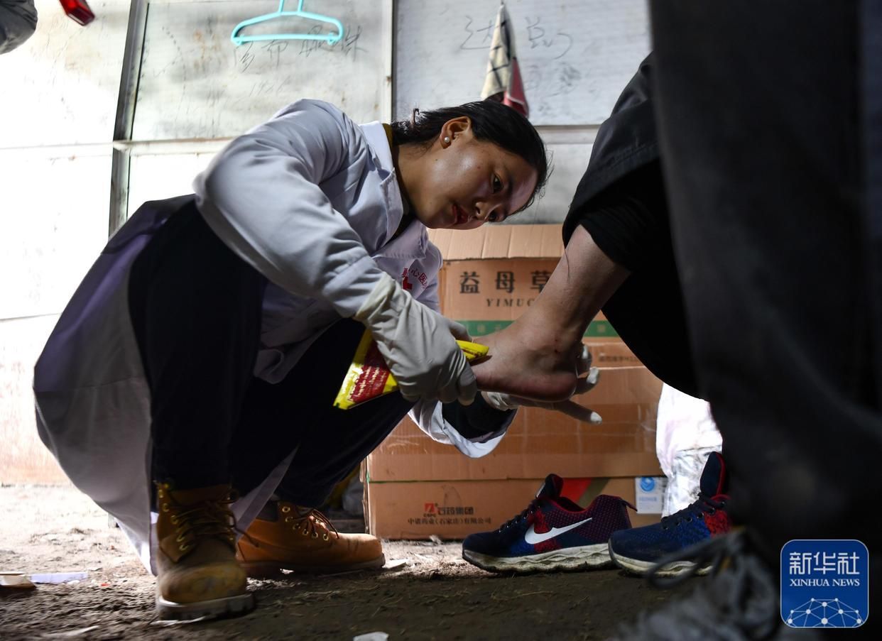 西藏那曲市比如縣良曲鄉(xiāng)然木塘村蟲草采集點的營地里,政府為采集點配備的醫(yī)護人員在給采集蟲草時受傷的牧民治療(5月26日攝)。新華社記者 晉美多吉 攝