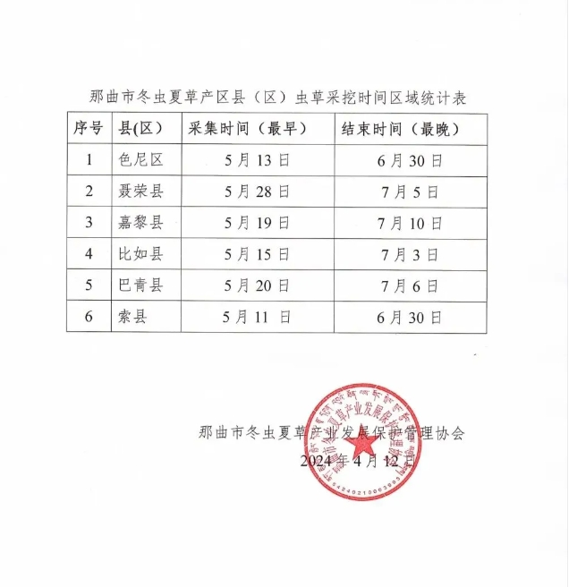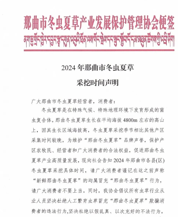 冬蟲夏草是在特殊氣候、特殊地理環(huán)境下發(fā)育形成的菌蟲復(fù)合體,那曲冬蟲夏草生長在平均海拔4800m左右的高山上,因其生長區(qū)域海拔高,冬蟲夏草采挖季節(jié)相比其他產(chǎn)區(qū)采集時(shí)間較晚,為維護(hù)“那曲冬蟲夏草”品牌聲譽(yù),保護(hù)產(chǎn)區(qū)農(nóng)牧民、經(jīng)營者和廣大消費(fèi)者的合法權(quán)益,促進(jìn)那曲冬蟲夏草產(chǎn)業(yè)高質(zhì)量發(fā)展,現(xiàn)向社會告知2024年那曲市各縣(區(qū))冬蟲夏草采挖具體時(shí)間,請廣大消費(fèi)者謹(jǐn)記在這之前聲稱“新鮮那曲冬蟲夏草”的均屬冒充“那曲冬蟲夏草”行為,請廣大消費(fèi)者不要上當(dāng)。同時(shí),我協(xié)會倡議所有蟲草行業(yè)從業(yè)人員堅(jiān)決杜絕人工繁育蟲草冒充“那曲冬蟲夏草”欺騙消費(fèi)者的違法行為,堅(jiān)決杜絕以假亂真、以次充好的不法行為。